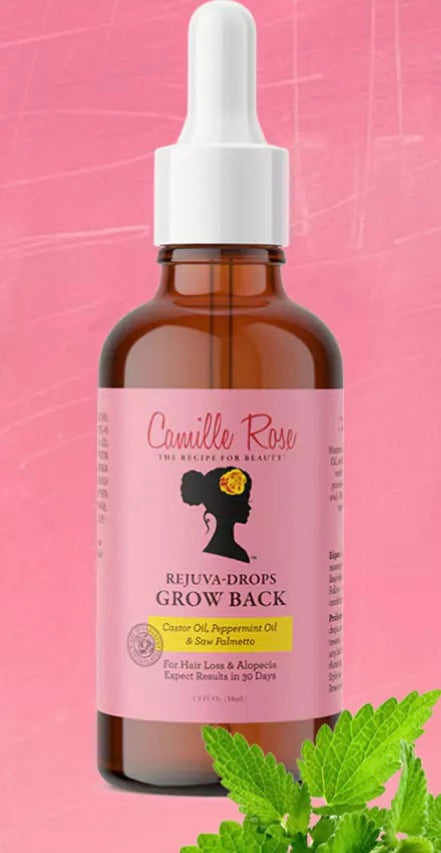 Hair growth drops infused with saw palmetto, peppermint leaves, and castor beans to combat hair loss and damage.