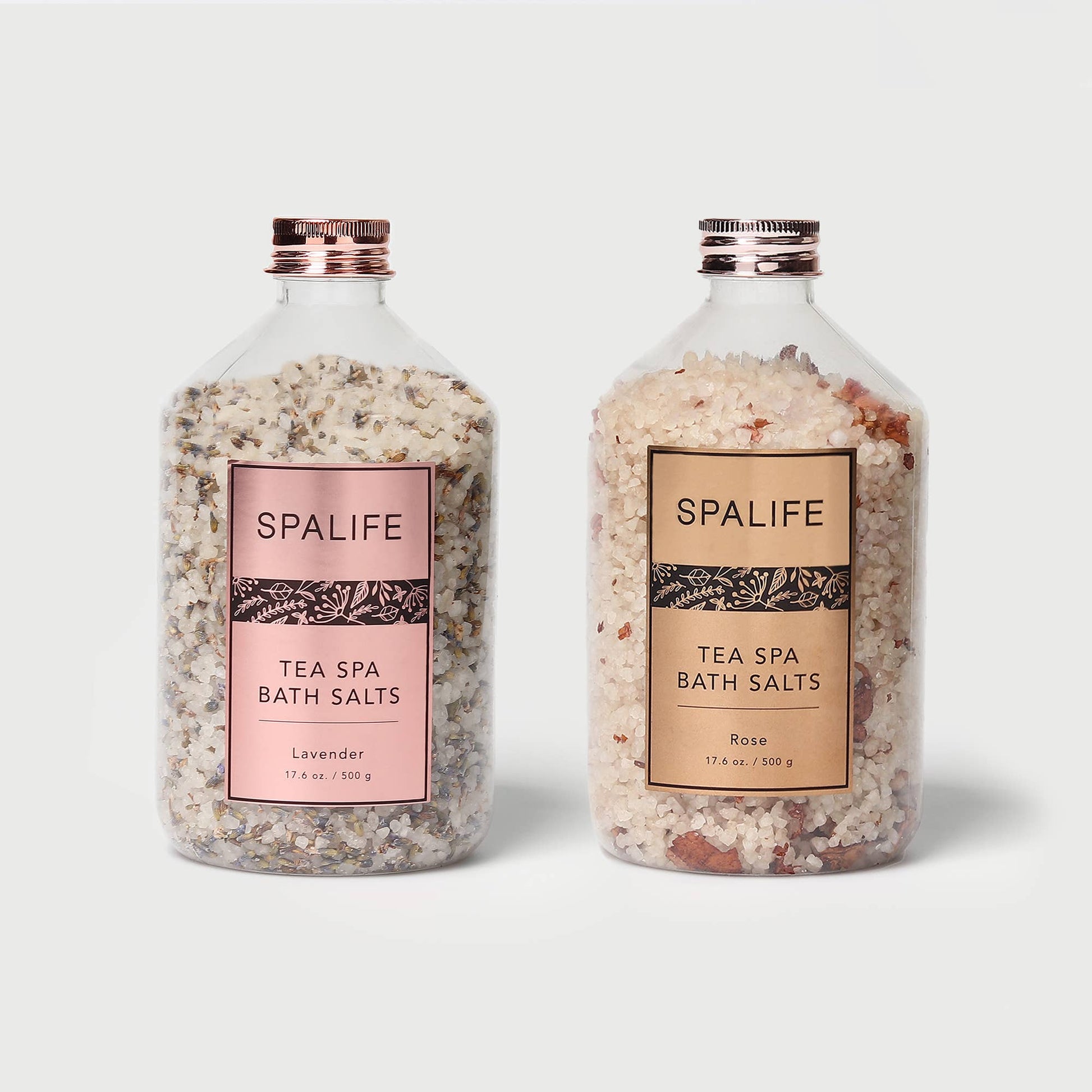For Relaxing Aromatherapy and Soothing Soaks! SpaLife's Petal-Infused Bath Salts. Formulated with dried petals, these salts rejuvenate and cleanse your skin, creating an aromatic and pampering oasis right in your tub. Includes Lavender and Rose jars, each filled with 17.6oz/500g of petal-infused bath salts. Why We Love it: * LAVENDER: Relax and unwind as you melt into the soothing aromatherapy of lavender. Our tranquil bath salt not only cleanses and calms your skin but also brings peace to your mind, turning your bath into a serene escape. * ROSE: Experience the magic of rose-infused skincare. Our bath salts utilize the soothing qualities of rose to diminish redness, calm irritated skin, and offer comfort during your relaxing soak. LET'S DO THIS: * Pour 2-3 tablespoons of salt into freshly drawn bath. * Allow a few minutes for salts to dissolve. * Enjoy a relaxing bath experience.